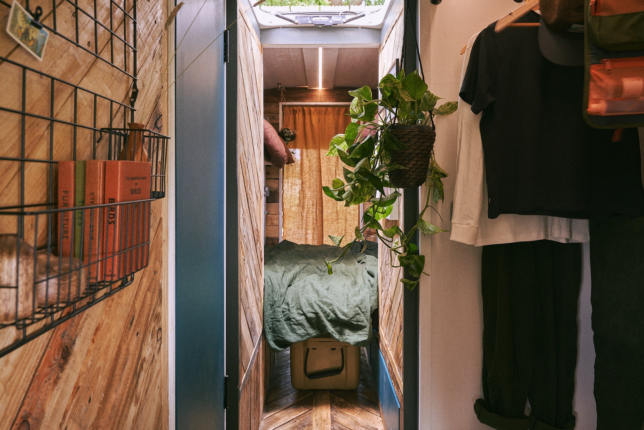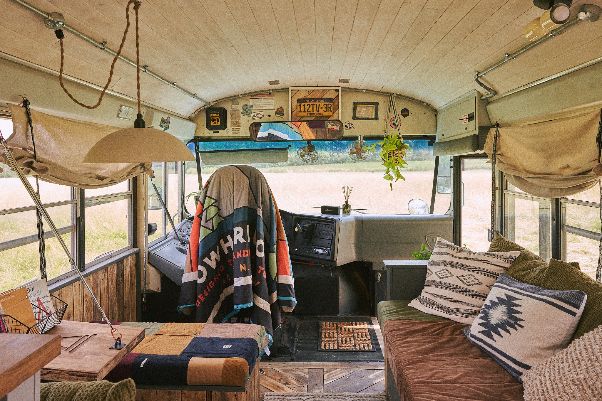 There's two sets of single bunk beds in the back, the bottom singles convert into a full sized double. Kids and Dogs are welcome, but the bunk singles might not be suitable for extra young'uns. While at Canopy & Stars, there’s a toilet and heated shower in a converted horse box next door. Future plans are to add a toilet and shower to the bus, we’re exploring the most responsible way to do this.