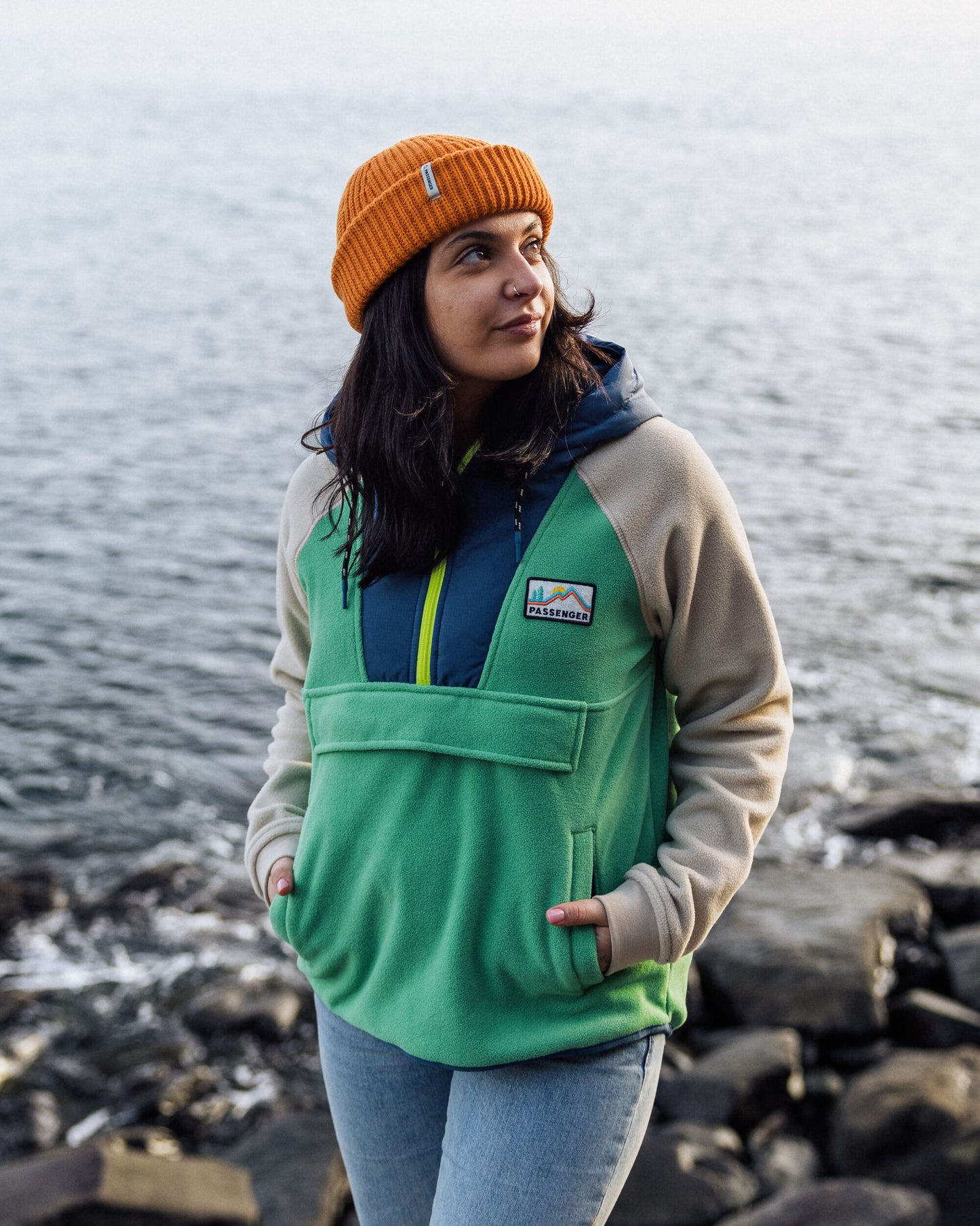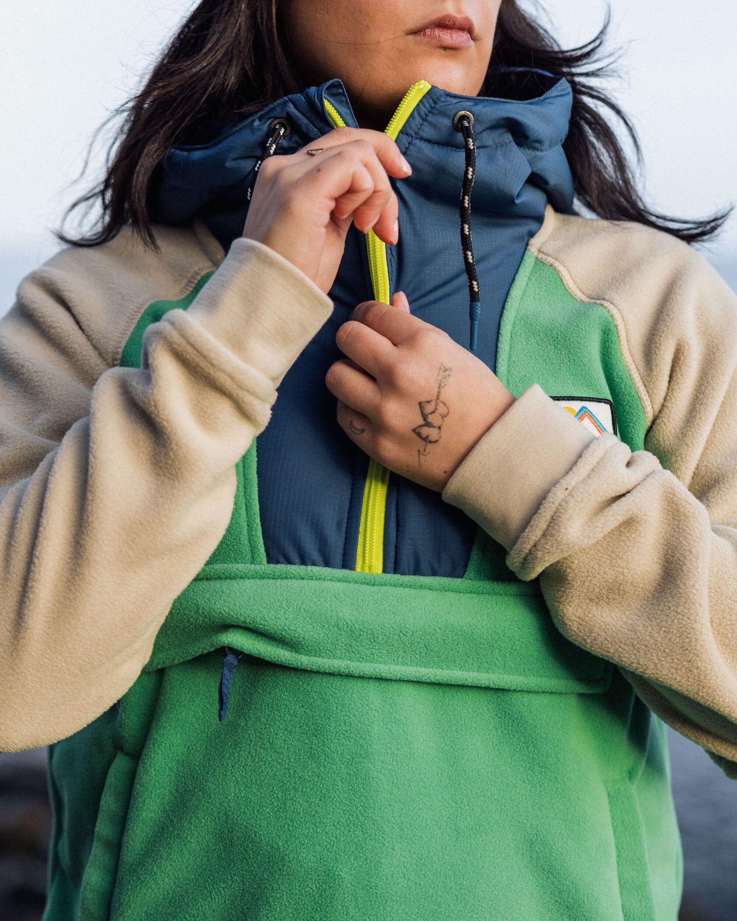 - Pouch pocket with a hand-warming Tricot lining and welt pockets.