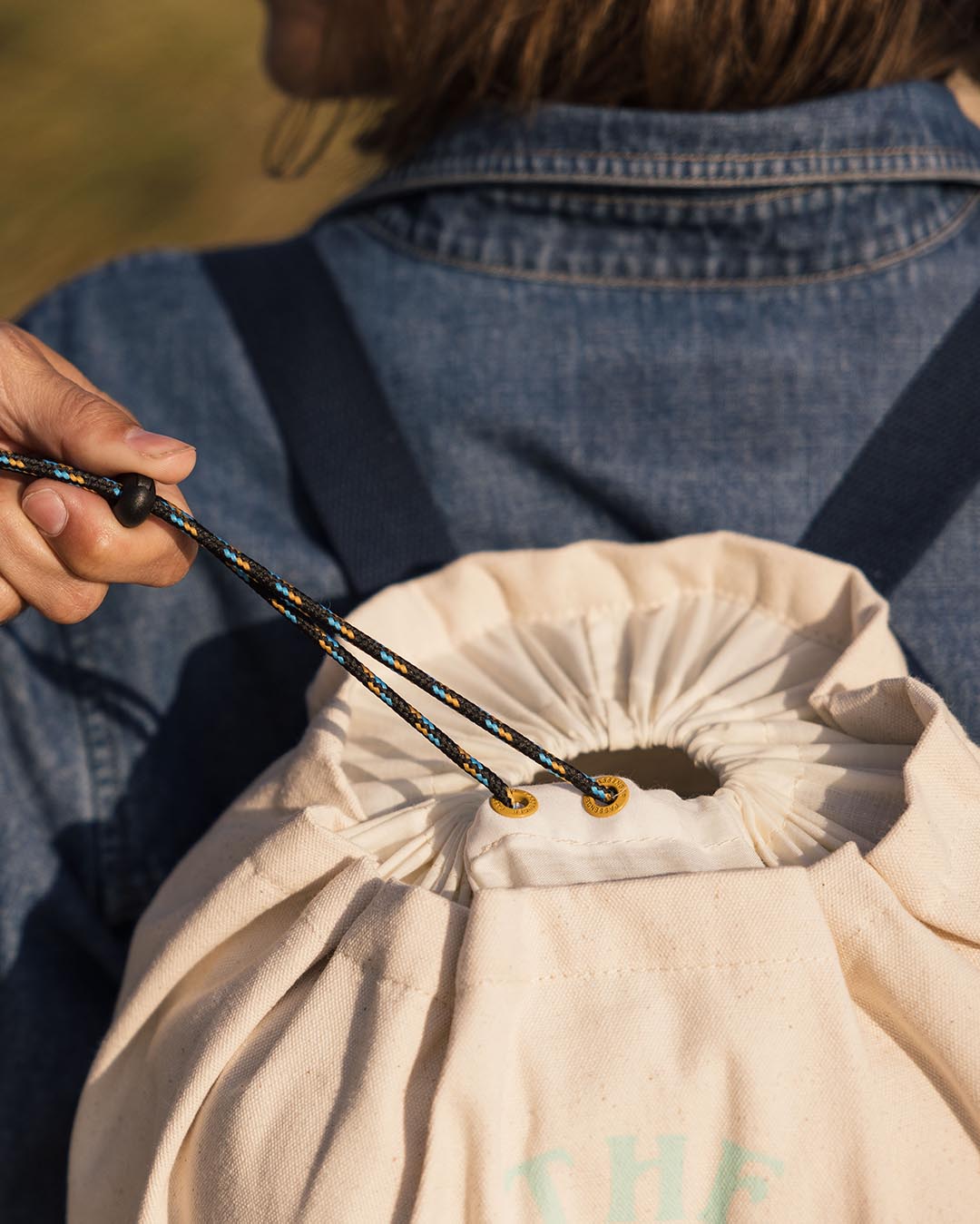 The Pico is an organic cotton tote bag with backpack straps and a drawstring closure, perfect for beach days or mid adventure picnics.